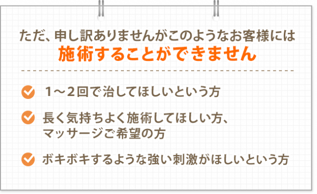 当院ではあなたにあった刺激で施術を行います。違う刺激だと、まったく改善しなかったり、すぐぶり返してしまいます。